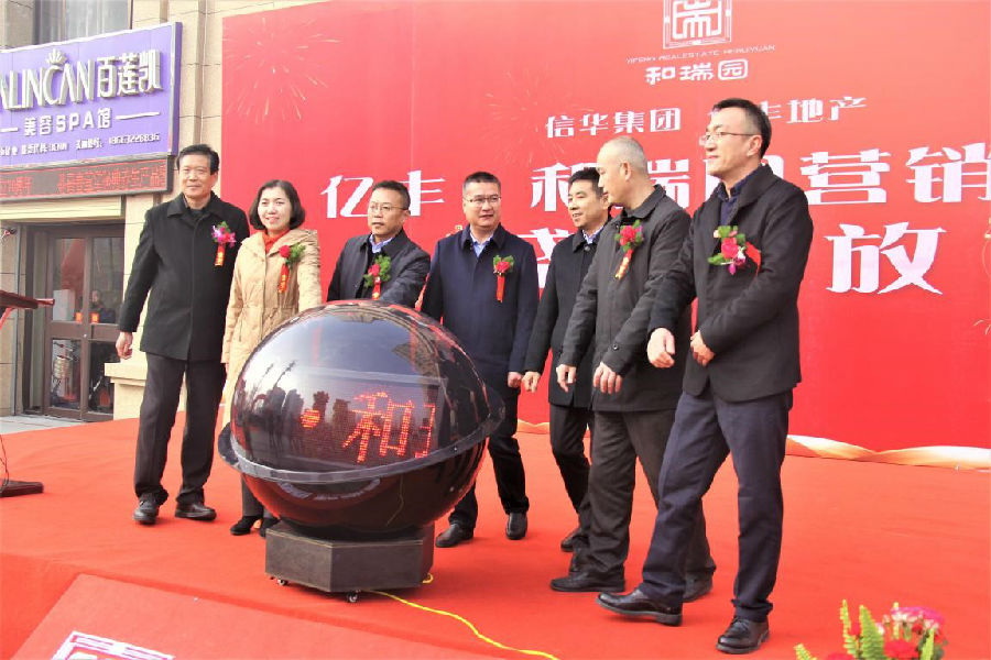 在广大来宾、客户及多方媒体的共同见证下,信华集团总经理杜泽坦,集团领导李自海、孔德涛、张大伟、朱颖,亿丰公司经理王涛、书记张明桂等领导共同启动激光球,宣布亿丰·和瑞园营销中心正式对外开放。