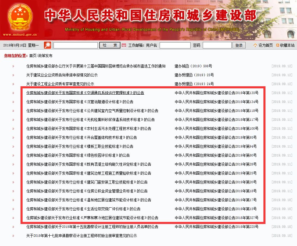 现批准《公共建筑室内空气质量控制设计标准》为行业标准,编号为JGJ/T461-2019,自2019年10月1日起实施。