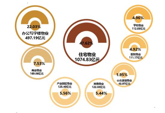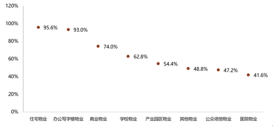 学校物业、产业园区物业、公众场馆物业、医院物业和其他物业分别占比62.8%、54.4%、47.2%、41.6%和48.8%。东吴物业、幸福基业、新大正物业、爱玛客等分别成为各专业细分业态领先企业。