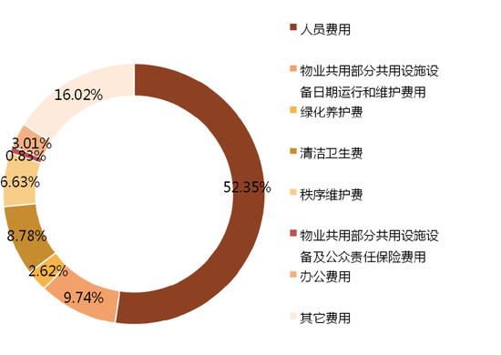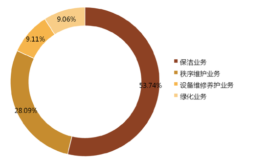 分岗位来看,保洁业务外包项目人员投入占比最高,达到53.74%,秩序维护业务、设备维护养护业务及绿化业务外包人员投入分别占比28.09%、9.11%和9.06%。基础物业服务的外包,将推动企业人员结构的优化和调整。