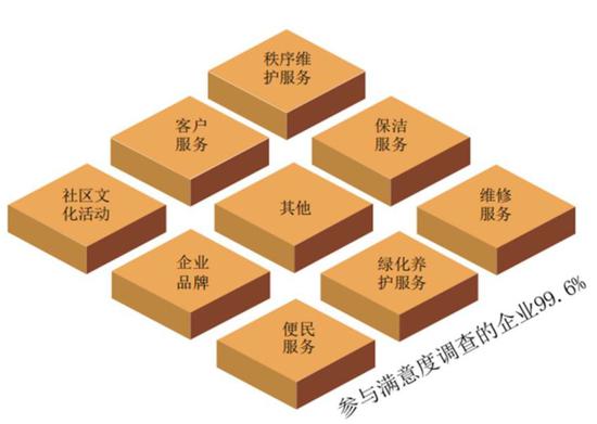 2018年,99.6%的500强企业开展了业主满意度调查,调研内容主要包括客户服务、秩序维护服务、保洁服务、维修服务、绿化养护服务、便民服务、企业品牌、文化活动等基本服务指标,另外也包括配餐服务、特约服务、会务服务等专业服务。