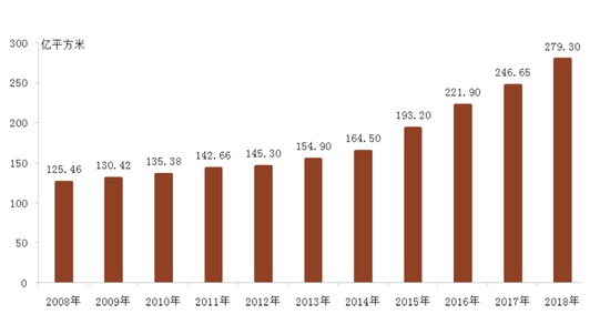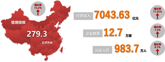 2018年,全国物业管理行业管理面积279.3亿平方米,相比2017年增加32.65亿平方米,增长率13.2%。